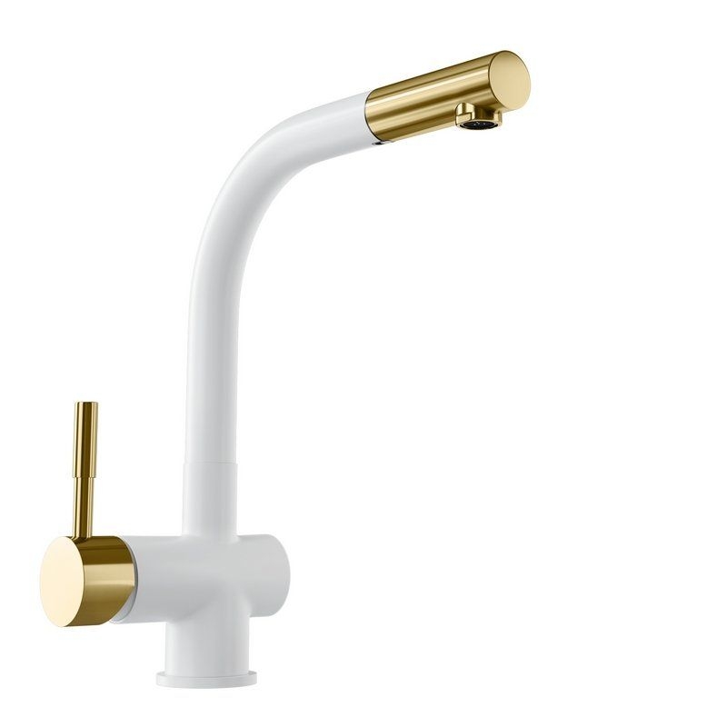 Dwukolorowe wykończenie: Biały korpus baterii komponuje się ze złotym pierścieniem u podstawy i matowo-złotą końcówką wylewki. To połączenie sprawia, że bateria pasuje zarówno do nowoczesnych, jak i klasycznych kuchni, dodając im blasku i elegancji.