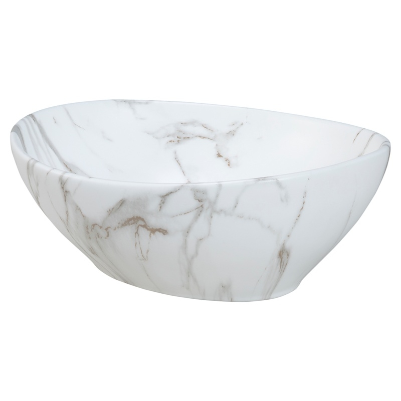 Umywalka Pati to idealne rozwiązanie dla każdej nowocześnie urządzonej łazienki. Model ten wyróżnia się modnym, marmurowym dekorem, który urozmaici przestrzeń i nada jej eleganckiego charakteru. Umywalka wykonana została z wysokiej jakości ceramiki, zatem jest niezwykle trwała i łatwa w czyszczeniu. Model Pati przeznaczony jest do zamontowania na blacie łazienkowym. Nie posiada otworu na baterię i przelewu.