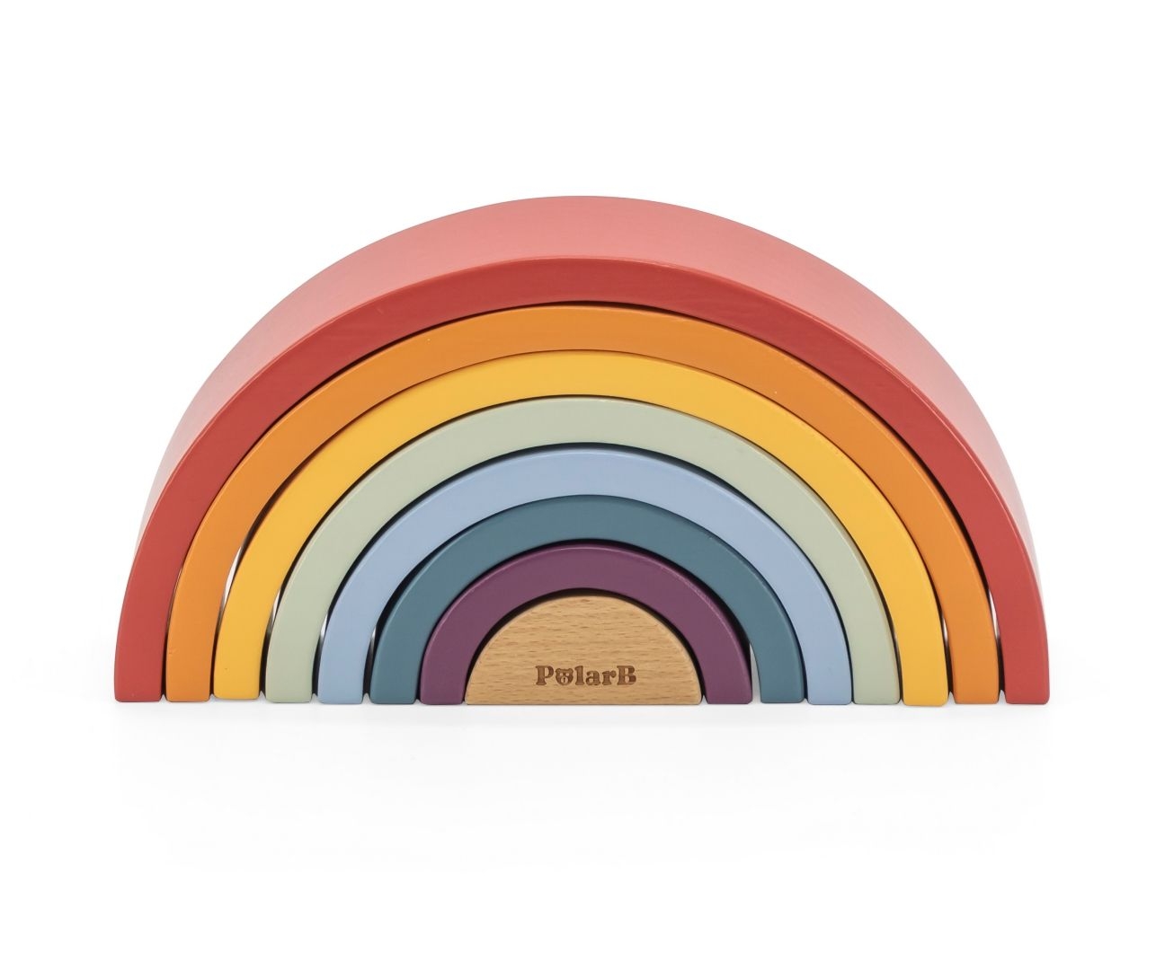 Zabawa polega na ułożeniu 7 kolorowych łuków wraz z półokrągłym klockiem w tęczę lub w inną, dowolną konstrukcję.