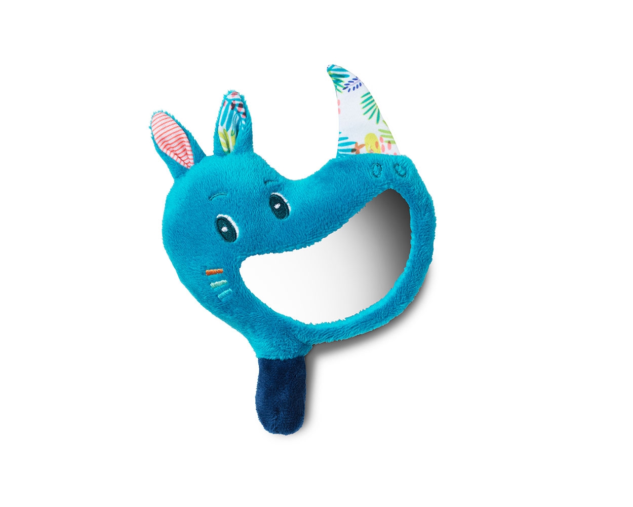 Bezpieczne i giętkie lusterko stanowi szeroki uśmiech charakterystycznego dla marki zwierzątka – niebieskiego Nosorożca Mariusa. Zabawka jest równocześnie grzechotką. Ma uszka i krótkie włosy z barwnych tasiemek i wydaje szeleszczący dźwięk przy pocieraniu. Pluszowy uchwyt jest łatwy do utrzymania w małych rączkach.