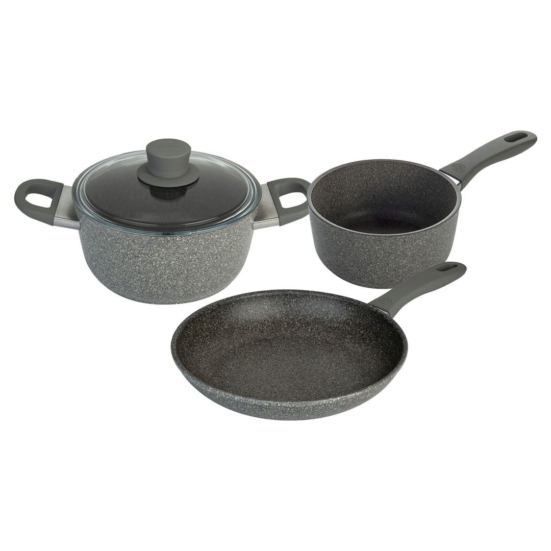 ” Eccellente ” to odpowiednie słowo opisujące ten zestaw garnków. 3-częściowy zestaw naczyń kuchennych zawiera garnek z pokrywką o średnicy 24 cm, rondelek o średnicy 18 cm i patelnię o średnicy 28 cm. Zestaw będzie w stanie potowarzyszyć Ci przez cały proces gotowania – daj się zaskoczyć różnorodności i jakości naszych naczyń kuchennych! Wytrzymała 5-warstwowa powłoka nieprzywierająca GRANITIUM Extreme doskonale nadaje się do intensywnego użytkowania i ułatwia czyszczenie naczyń. Zalecamy delikatne mycie ręczne, ale garnki można także myć w zmywarce. Dzięki solidnej aluminiowej konstrukcji nie musisz dłużej czekać na osiągnięcie idealnej temperatury gotowania. Ponadto, na stole garnki prezentują się w eleganckim stylu dzięki projektowi mediolańskiego studia Matteo Thun & Antonio Rodriguez.