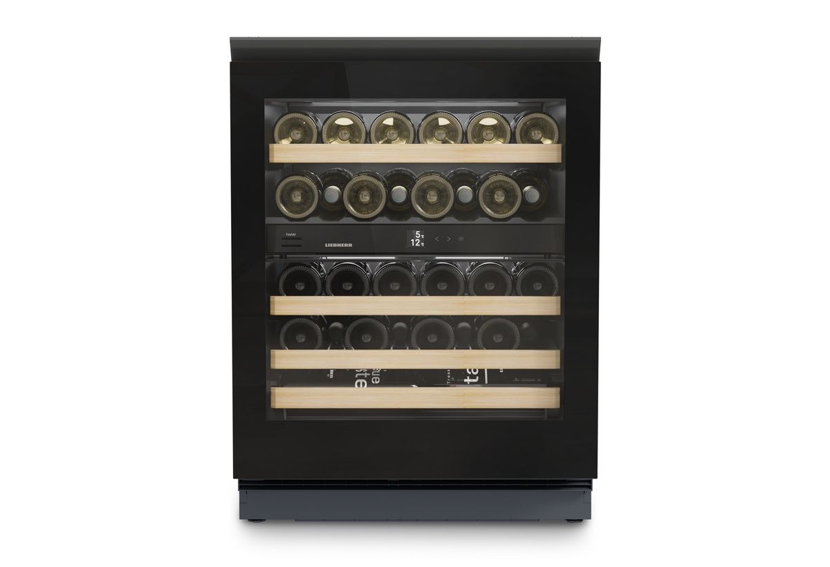 Sterowanie · Wyświetlacz ciekłokrystaliczny, monochromatyczny za drzwiami, elektronika dotykowa · Cyfrowy wyświetlacz temperatury dla 2 stref · Sygnał ostrzegawczy w przypadku awarii: wizualny i akustyczny · Alarm otwartych drzwi: wizualny i akustyczny · Zabezpieczenia przed dziećmi Winiarka · 2 strefy temperatur, każda z możliwością regulacji od +5 °C do +20 °C · 2 indywidualnie regulowane obiegi chłodnicze · Chłodzenie konwekcyjne, filtr z węglem aktywowanym FreshAir, gwarantujący świeże powietrze · Ustawienie wilgotności na dwóch poziomach · Oświetlenie strefowe LED włączone na stałe, przyciemniane · Półki metalowe z frontem drewnianym · 5 półek, w tym 3 na prowadnicach teleskopowych Zalety wyposażenia · Podchwyt · Uchwyty do transportu z tyłu · Regulowane nóżki z przodu i z tyłu · Zamienne zawiasy drzwiowe