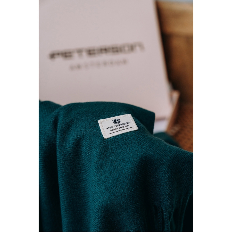 Stylowy szal damski Peterson w odcieniu butelkowej zieleni. Wykonany z miękkiego, ciepłego materiału, idealny na chłodne dni. Gładka, dwustronna struktura i frędzle dodają elegancji. Świetny na prezent!