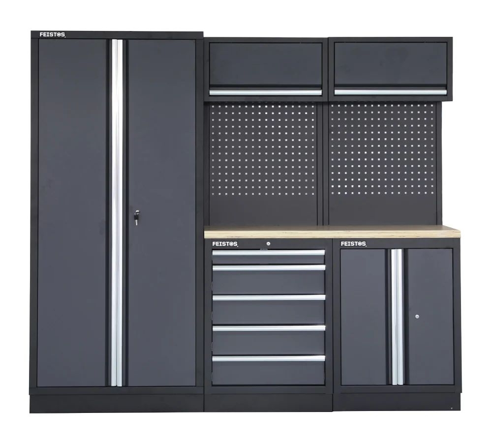 Wyposażenie warsztatu FEISTOS | Szafka narzędziowa Apollo 1 | łącznie z perforowaną ścianą | Szary/Czarny | 228x46x200cm