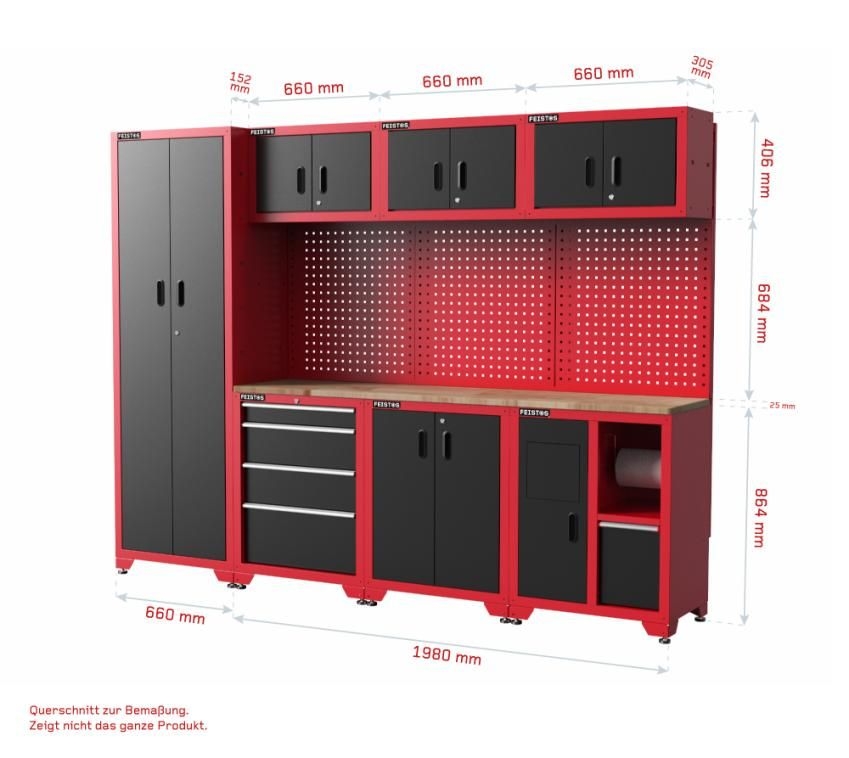 Sprzęt warsztatowy FEISTOS | Szafka narzędziowa Juno 15 | w tym tablica perforowana Czarny/Czerwony | 330x46x198 cm