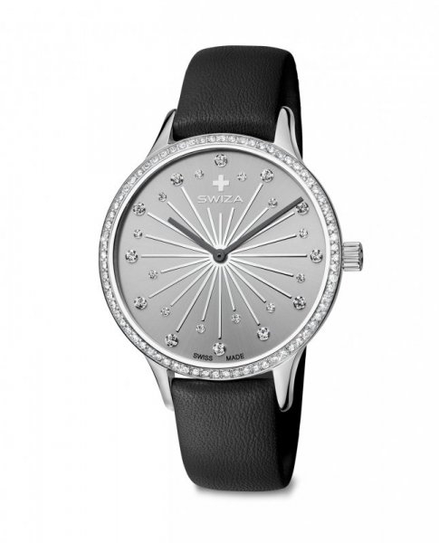 Zegarek damski STELLA, SST, grey, black WAT.0631.1006 Specyfikacja:Koperta ze stali nierdzewnejWodoodporny (50 metrów / 99 stóp)Średnica koperty: 37 mmMechanizm Swiss QuartzWskaźnik datySzerokość paska: 16mmSzafirowe szkło zegarka – wysoka odporność na zarysowaniaGwarancja 3 lata. Zegarki SWIZA objęte są 3-letnią gwarancją na wady materiału i wady w wykonaniu, licząc od dnia zakupu.Instrukcja obsługi http://www.swiza.com/en/Brand/Services/User-s-manual.htmlKoperta w klasycznym stylu jest pokryta powłoką PVD w kolorze srebra i posiada kryształowe szkiełko pokryte powłoką szafirową. Na czytelnej tarczy znajdują się kamienie ozdobne w kolorze diamentu. Prostota i piękno tej tarczy podkreślona jest elegancją smukłych wskazówek.Dzięki precyzyjnemu szwajcarskiemu mechanizmowi kwarcowemu trzy złote wskazówki płynnie suną po tarczy z datownikiem na godzinie 3….