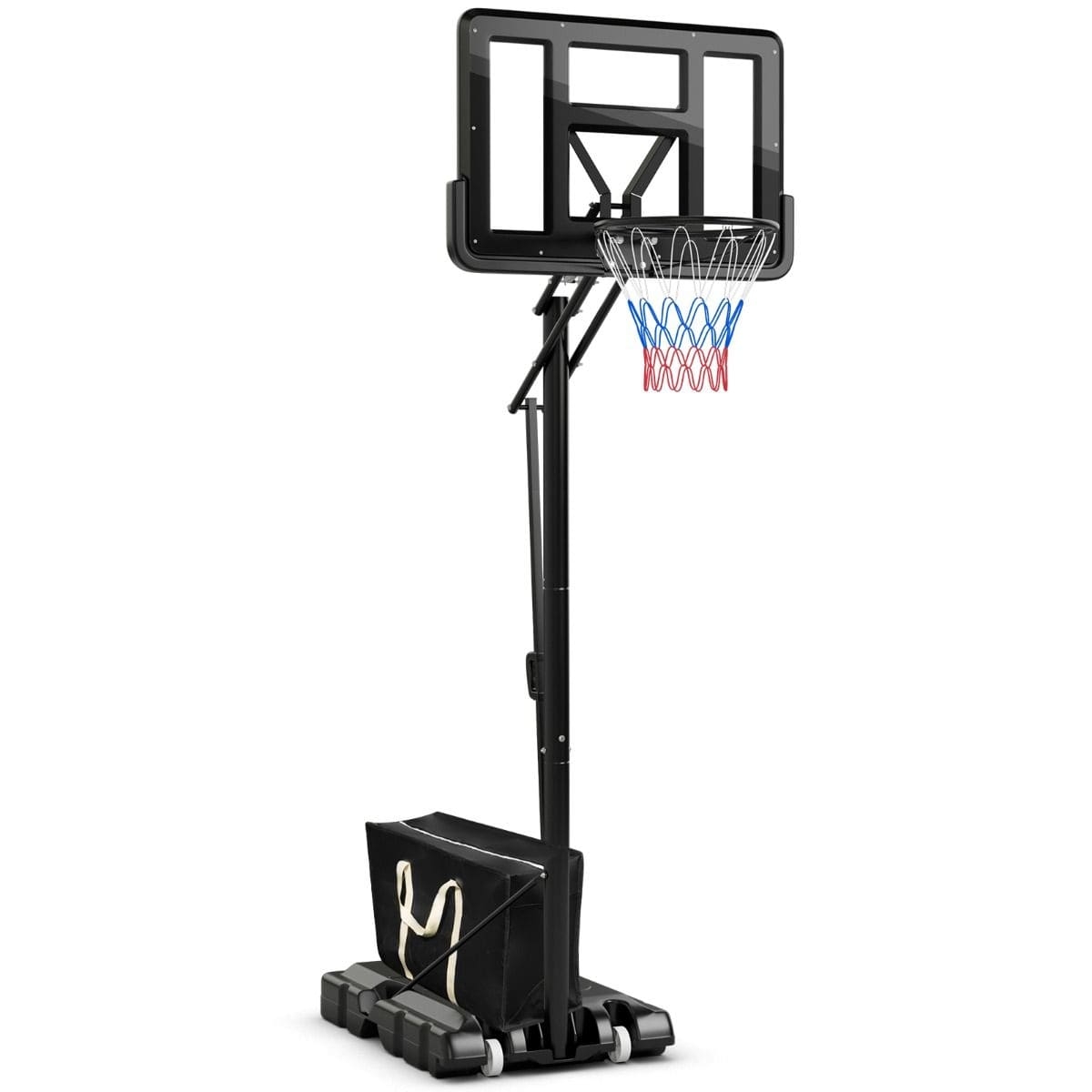 Przenośny zestaw do koszykówki z dodatkowym obciążeniem oferuje 10 poziomów regulacji wysokości (143–305 cm), co sprawia, że jest idealny dla graczy w każdym wieku. Trwała tablica z PET i wzmocniona podstawa wypełniana wodą lub piaskiem zapewniają stabilność i trwałość. Dzięki wbudowanym kołom kosz można łatwo przemieszczać, a wygodna półka na piłkę dodaje praktyczności. Odporny na warunki atmosferyczne, nadaje się do użytku zarówno w pomieszczeniach, jak i na zewnątrz. W zestawie znajduje się worek zabezpieczający oraz instrukcja montażu. 10 poziomów regulacji wysokości: Kosz można dostosować do wzrostu graczy, oferując zakres regulacji od 143 do 305 cm. Dzięki szybkiej regulacji za pomocą uchwytu i dwóch mocnych sprężyn zmiana wysokości jest łatwa i wygodna. Wzmocniona tabliczka o długości 111 cm: Trwała tablica z grubego PET zapewnia wyjątkową wytrzymałość na uderzenia, a zaokrąglone krawędzie zwiększają bezpieczeństwo. Konstrukcja typu „Y” oraz dwie sprężyny amortyzujące sprawiają, że tabliczka jest odporna nawet na intensywne użytkowanie. Wzmocniona i stabilna podstawa z PE: Podstawa kosza może być wypełniona 55–58 litrami wody lub 65 kg piasku, co zapewnia stabilność podczas gry. Trójkątna konstrukcja dodatkowo wzmacnia całą strukturę. W zestawie znajduje się również worek zabezpieczający, który można umieścić na podstawie po wypełnieniu jej piaskiem. Przenośny i mobilny design: Dzięki dwóm wbudowanym kołom kosz można łatwo przemieszczać w dowolne miejsce. To idealne rozwiązanie do użytku w halach sportowych, na boiskach, w ogrodach czy na podjazdach. Odporność na warunki atmosferyczne: Metalowe elementy pokryte są powłoką antykorozyjną, a wytrzymała obręcz i siatka odporne są na działanie czynników zewnętrznych. Kosz może być używany zarówno w deszczowe, jak i słoneczne dni. Dodatkowo, wygodna półka na piłkę na podstawie ułatwia przechowywanie.