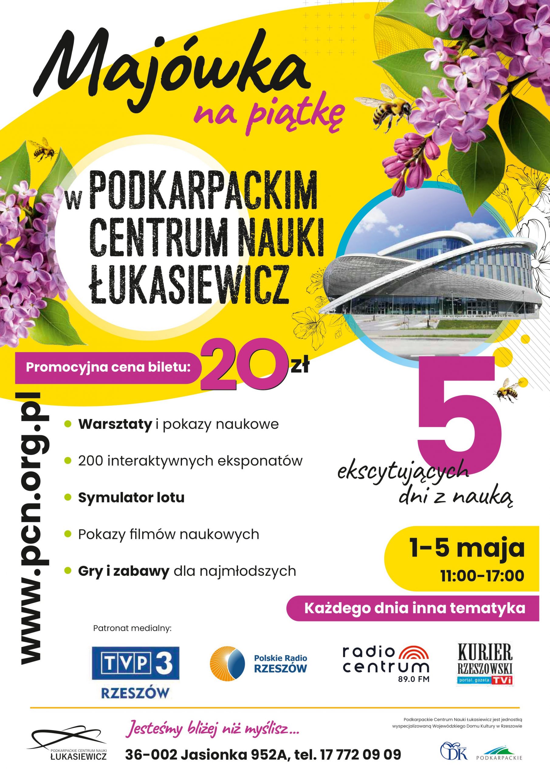 W dniach 1-5 maja 2024 w Podkarpackim Centrum Nauki Łukasiewicz odbędzie się wydarzenie „Majówka na piątkę”. Przez pięć dni PCN będzie otwarte dla zwiedzających codziennie od godziny 11:00 do 17:00, a każdy dzień będzie miał inny temat przewodni. Serdecznie zapraszamy wszystkich do wspólnego spędzenia długiego majowego weekendu.